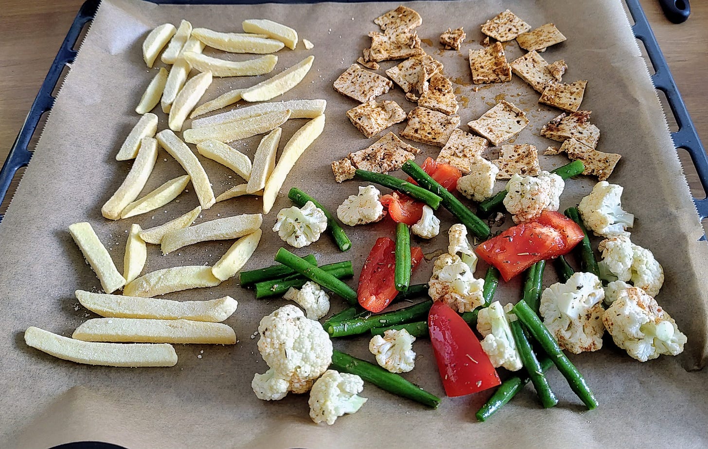 4. In the oven preheated to 200 degrees Celsius you bake all of that for about 15 to 25 minutes with air circulation (I bake veggies and fries for 25 minutes, but add the tofu 10 minutes later in the process).